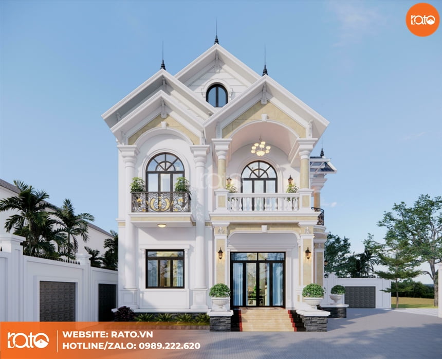 Hình khối rõ nét mạch lạc với cách sử dụng chi tiết cổ điển đặc trưng như hệ cột vuông, cột trụ chân lớn, cửa sổ với mái vòm uốn cong hay chi tiết phào chỉ đắp vẽ đẹp mắt… Cùng với gam màu trắng chủ đạo nhấn nhá chút tone vàng làm cho công trình trở nên cuốn hút người nhìn. Các thiết kế tập trung sử dụng nhiều cho vị trí mặt tiền 2 bên tạo ra sự dễ chịu từ hình khối tới kiến trúc xây dựng.