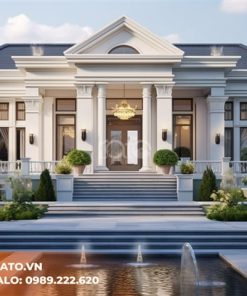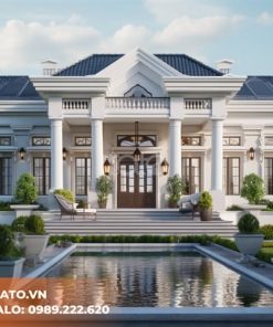 Phương án 5 được thiết kế thêm phần sảnh phía trái công trình kết hợp với mảng kính cường lực lớn tạo không gian thoáng đãng cho mẫu nhà vườn này.